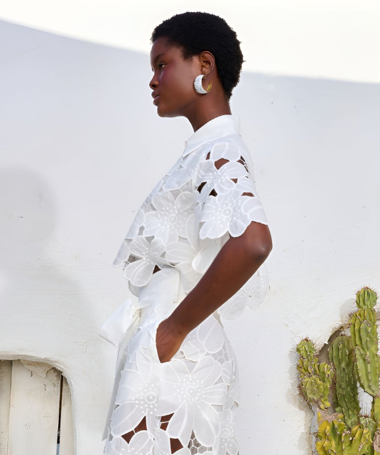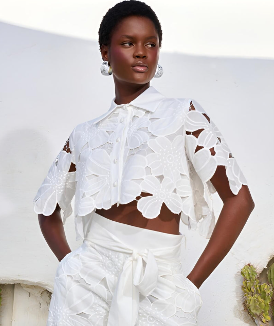 Dieses exquisite zweiteilige Ensemble besteht aus einem zarten Hemd mit Spitzenbesatz und einer Hose mit weitem Bein, die perfekt für jeden Anlass geeignet ist. Die subtilen floralen Akzente verleihen ihm einen Hauch von Romantik und machen es zu einer vielseitigen Wahl vom Brunch bis zur Abendveranstaltung.
