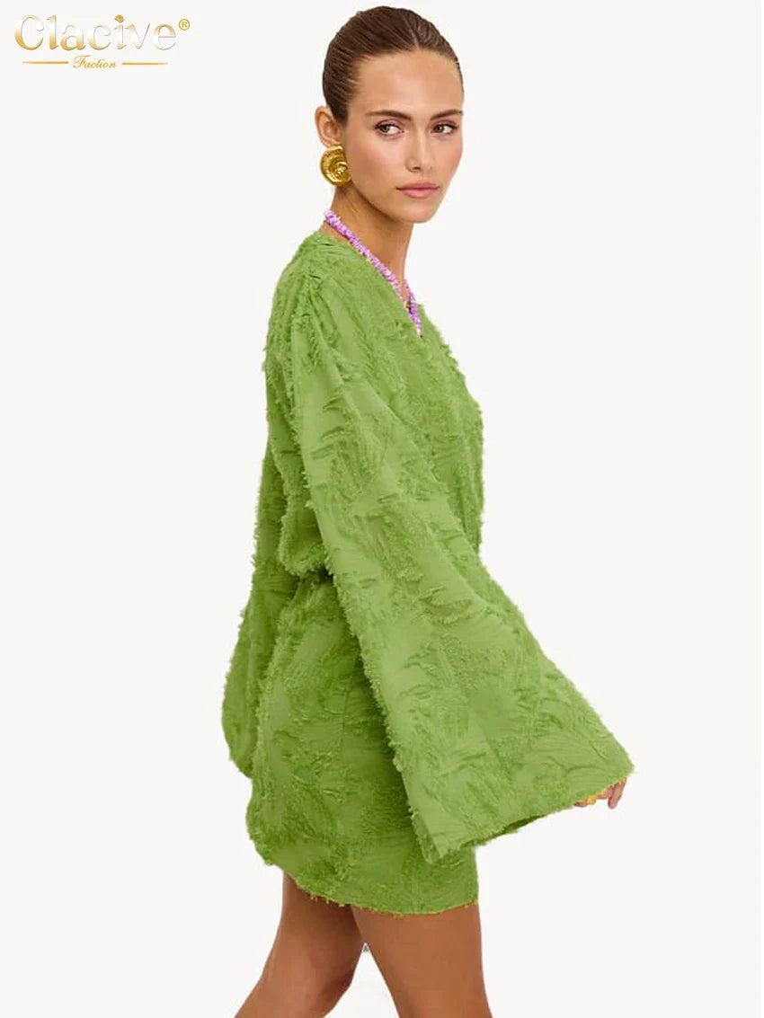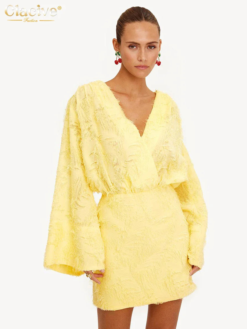 Clacive Herbst Lose Gelb Casual Frauen Kleider 2024 Sexy V-ausschnitt Langarm Mini Kleid Elegante Klassische Hohe Taille Weibliche Kleid