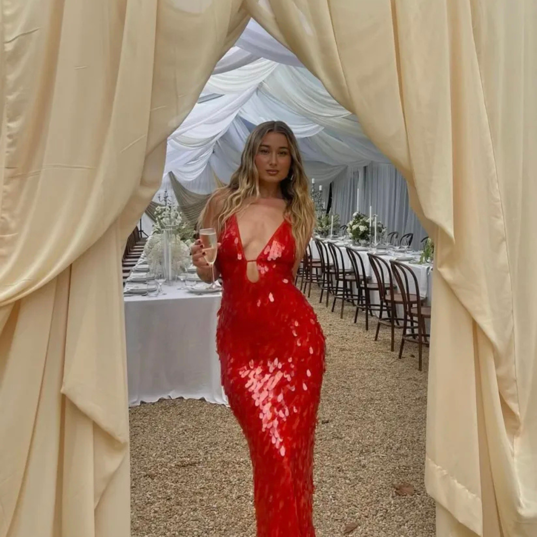Damen Pailletten Slim Fit Hochzeitsgast Kleid | Maxi