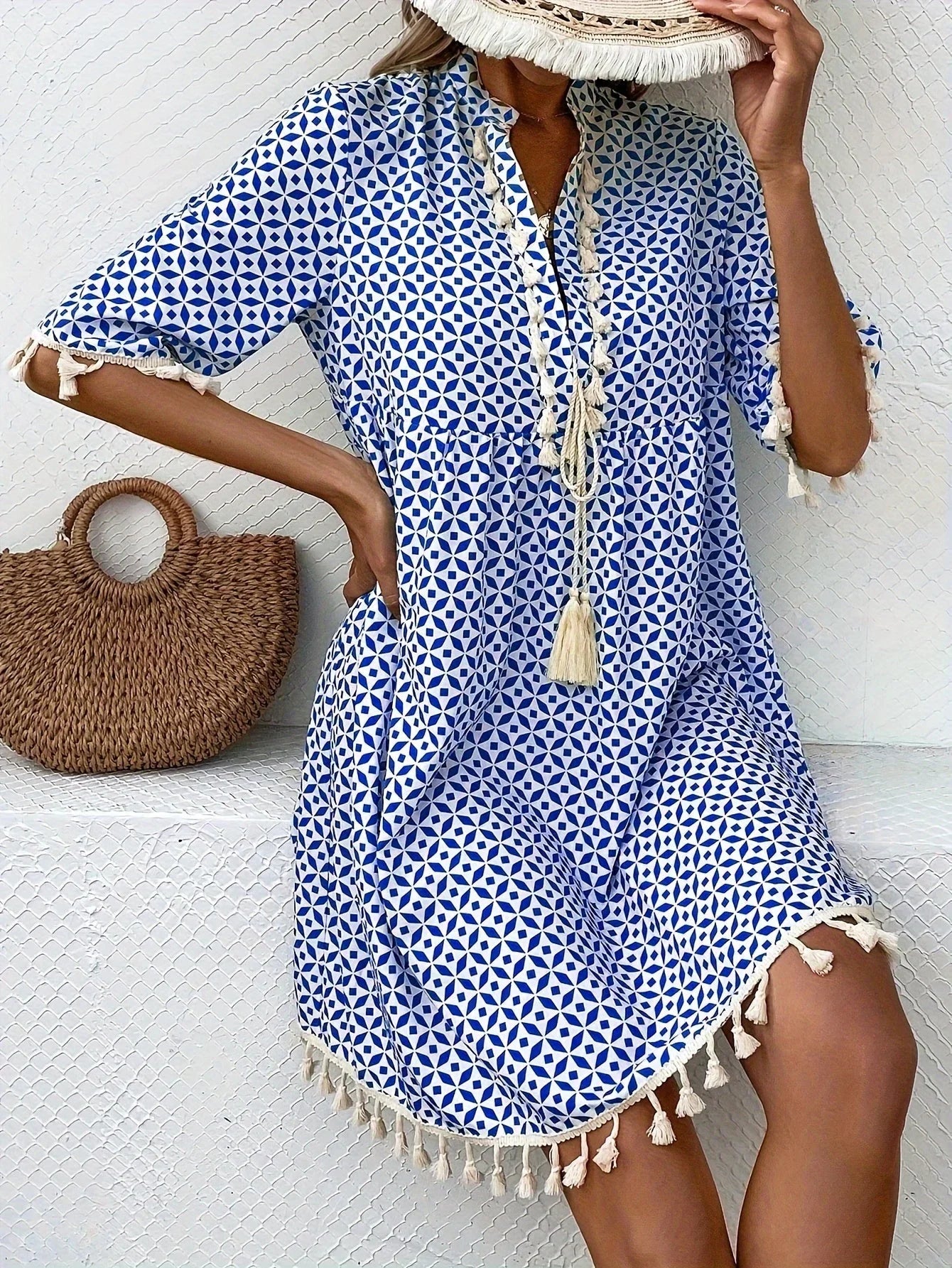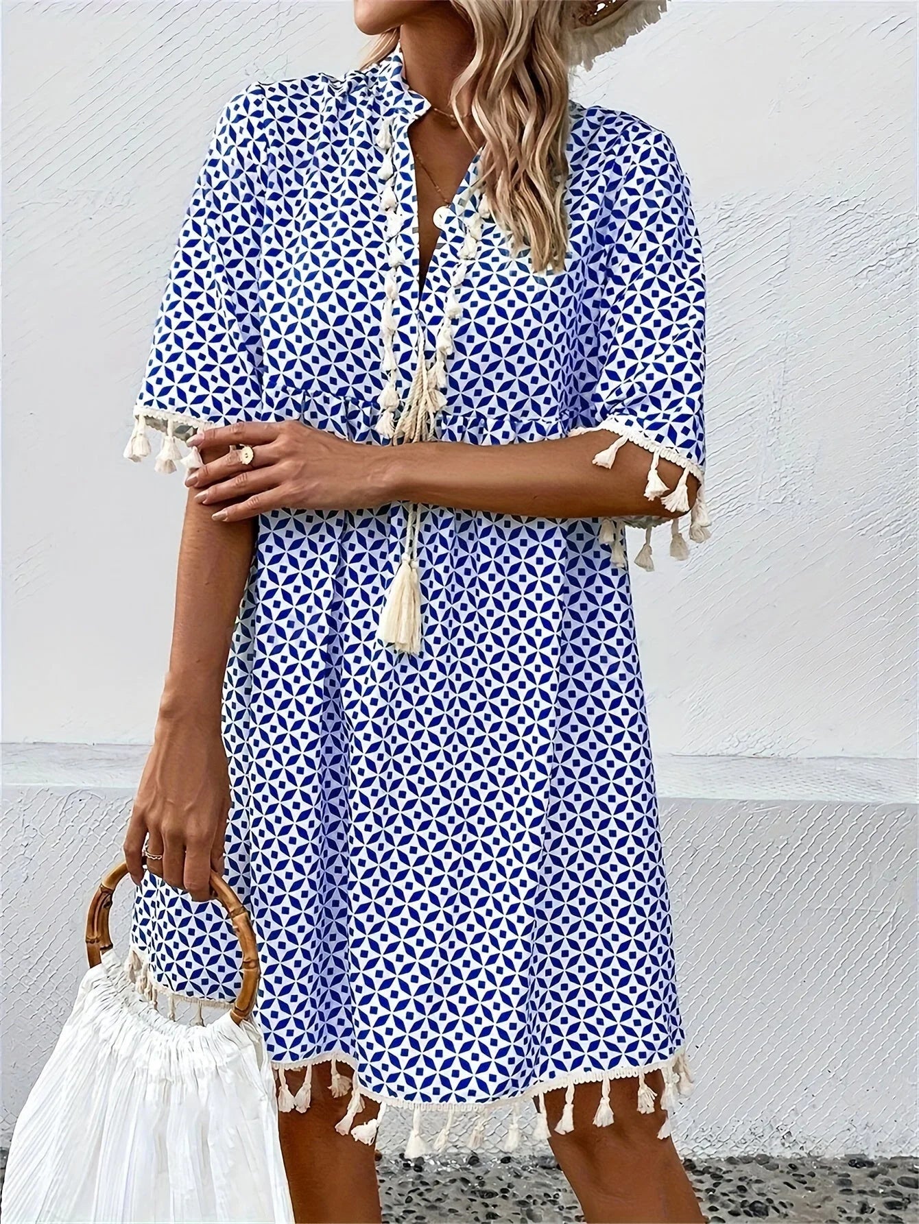 Entdecken Sie den perfekten Begleiter für sonnige Tage und laue Abende. Dieses charmante Tunika-Kleid in einem auffälligen Weiß-Blau Muster bietet eine leichte und luftige Passform, die sowohl Komfort als auch Stil garantiert. Die eleganten Quastendetails verleihen eine spielerische Note, ideal für jede Gelegenheit, von einem Stadtbummel bis zum Strandspaziergang.