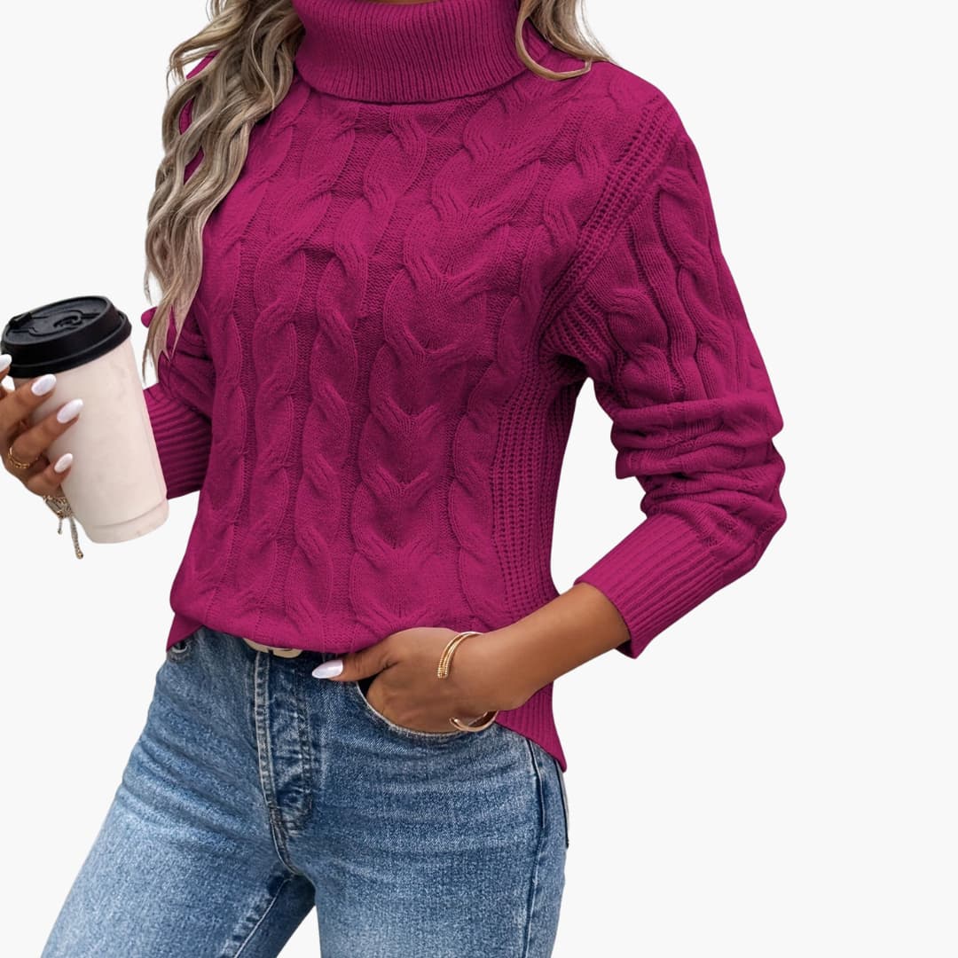 Zopfmuster-Rollkragenpullover für Damen mit gerippten Bündchen und Saum.