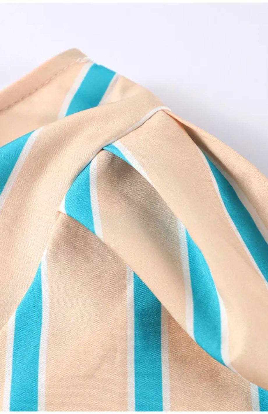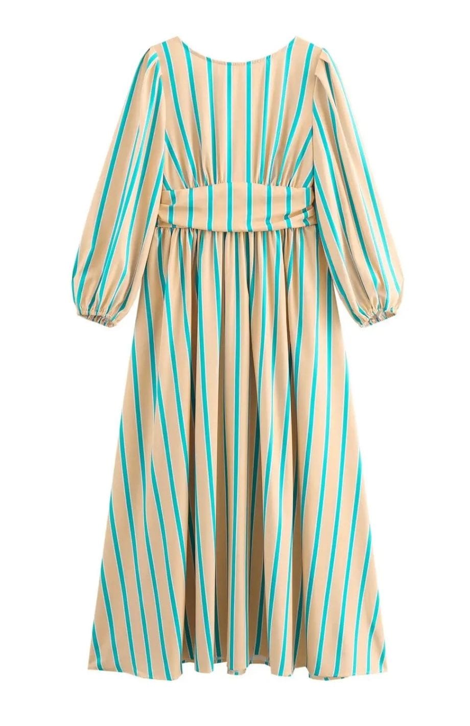 Diana – Elegantes, gestreiftes, rückenfreies Maxikleid ist die perfekte Wahl für Frauen, die mit Leichtigkeit und Raffinesse glänzen möchten. Die elegante Streifenoptik und das offene Rückendesign sorgen für einen femininen Look mit modernem Twist – ideal für warme Tage und besondere Abende.