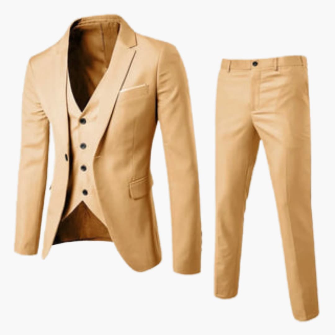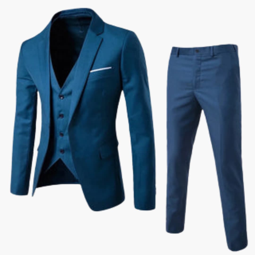 Dreiteilige Kombination: Sakko, Weste und Hose sind farblich und stilistisch aufeinander abgestimmt für ein einheitliches Gesamtbild.