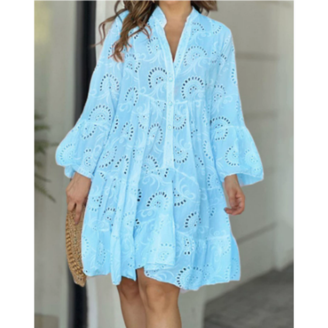 Mit dem Ember, einem fließenden Sommerkleid, das Sie die ganze Saison über kühl und stilvoll hält, können Sie den Sommer genießen. Dieses knielange Etuikleid hat einen schmeichelhaften V-Ausschnitt und elegante Schlagärmel, die Ihrem täglichen Look einen Hauch von Raffinesse verleihen. Das Ember-Kleid eignet sich perfekt für Frühling, Sommer und Herbst und sorgt dafür, dass Sie immer bequem und schick aussehen, egal zu welchem Anlass.