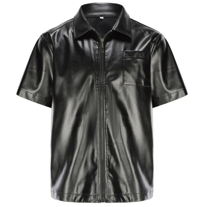 Herren lässige Kunstlederhemdjacke mit kurzem Arm und praktischen Reißverschlusstaschen Aliams