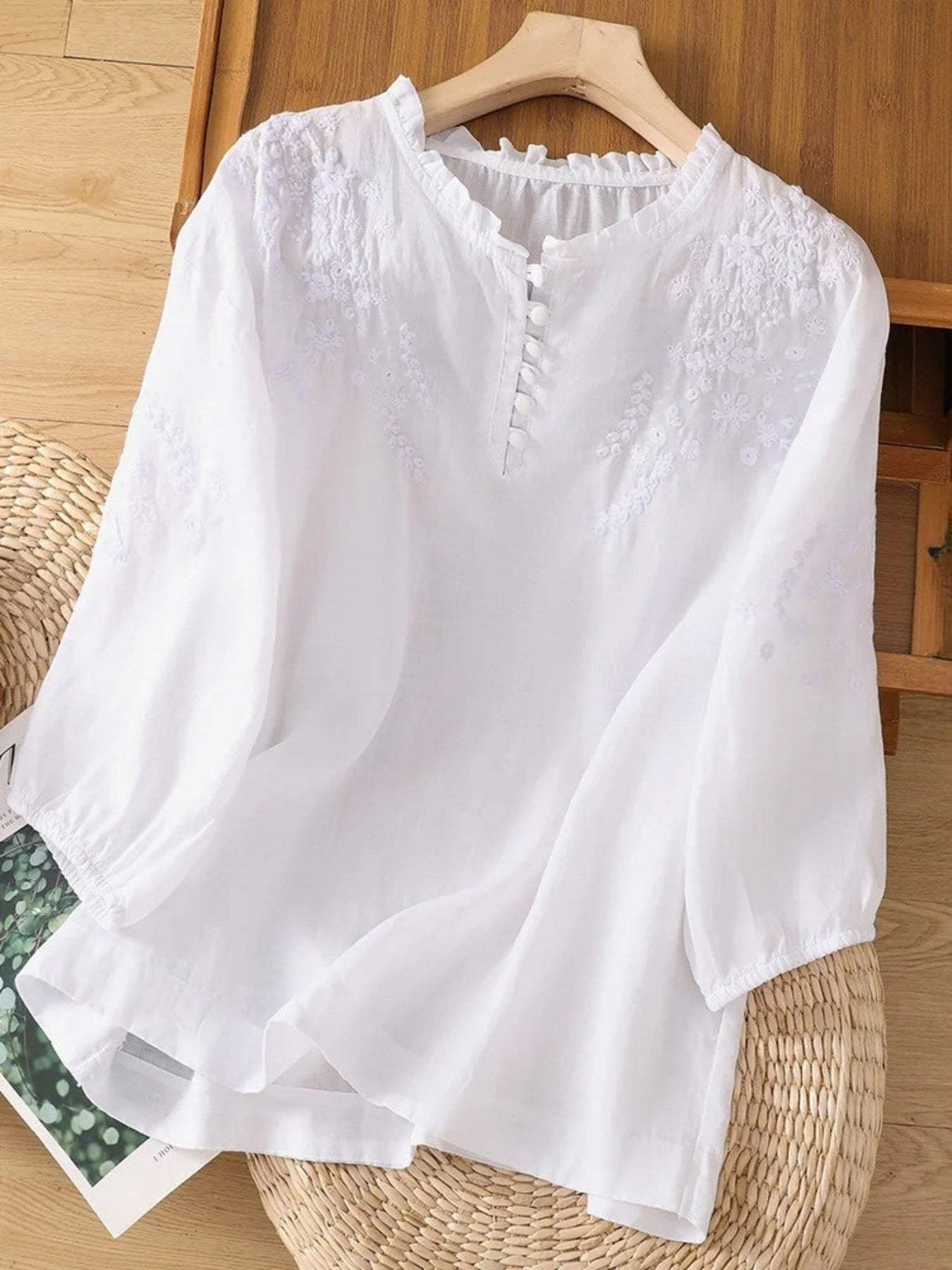 ✅Zarte Stickereien: Diese Bluse verfügt über elegante Stickereien auf der Vorderseite und den Ärmeln, die der klassischen Silhouette eine subtile Kunstfertigkeit verleihen. Die feinen Nähte bilden floral inspirierte Muster, die einen handgefertigten Charme versprühen. Sie sorgen für Struktur und Weichheit, ohne den Gesamt Schau zu überladen.