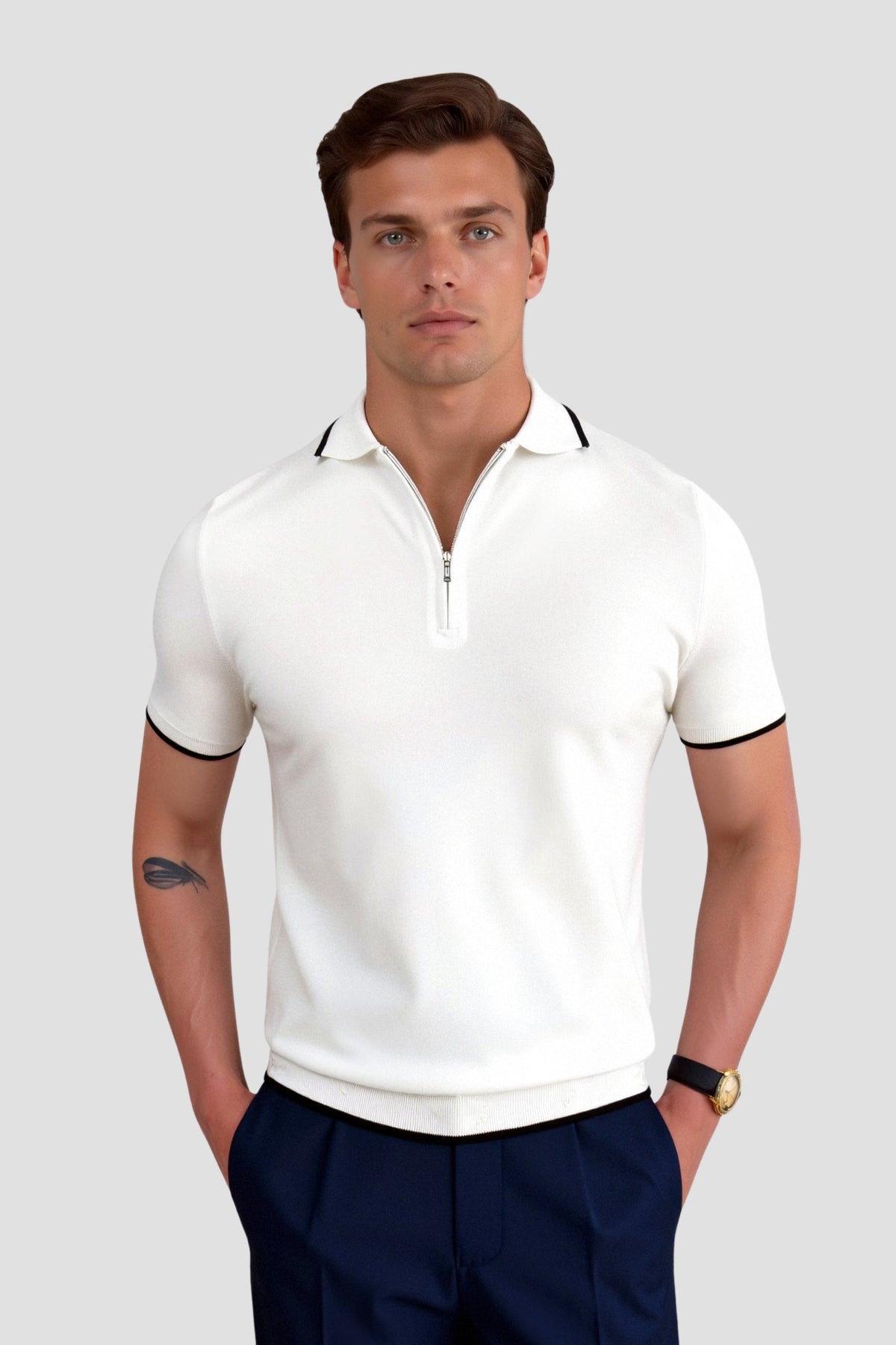 Ein modernes Poloshirt mit sportlich-elegantem Touch. Das cleane Design wird durch dezente Kontraststreifen an Kragen und Ärmeln aufgewertet. Der halbe Reißverschluss verleiht dem Shirt eine lässige Note und sorgt für vielseitige Styling-Optionen. Gefertigt aus weichem, atmungsaktivem Stoff, ist es ideal für einen stilvollen Look im Alltag oder im Büro.