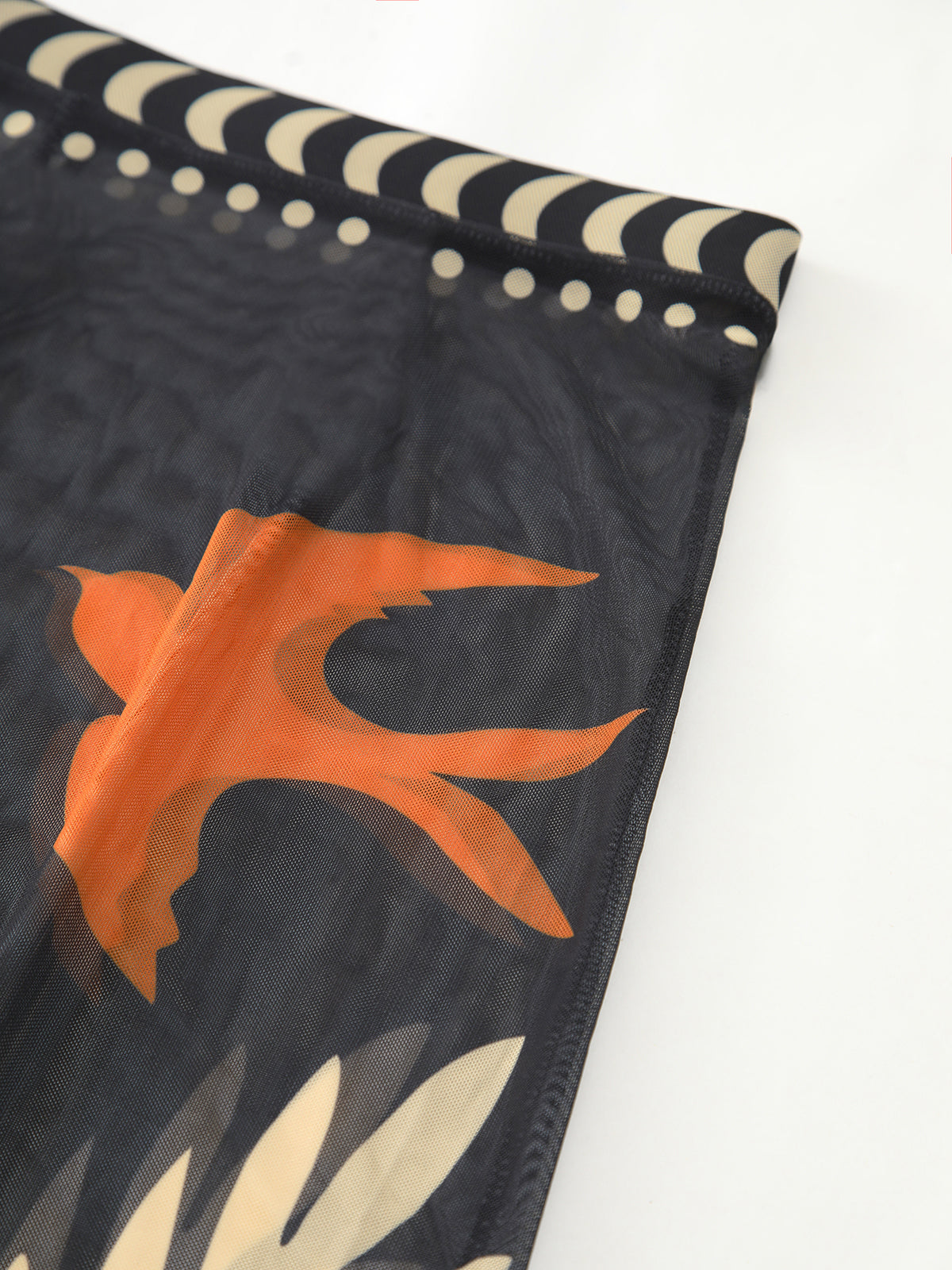 Verleihen Sie Ihrem Strandoutfit einen Hauch von tropischem Flair mit diesem leichten Maxirock. Der Vogelprint auf transparentem Mesh-Material sorgt für einen eleganten Look, der sowohl am Strand als auch beim Abendessen überzeugt.