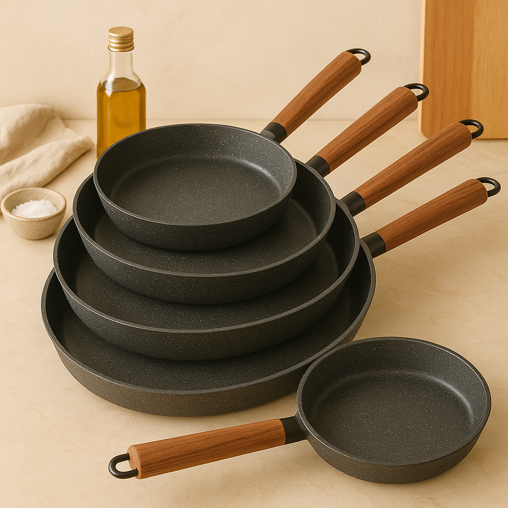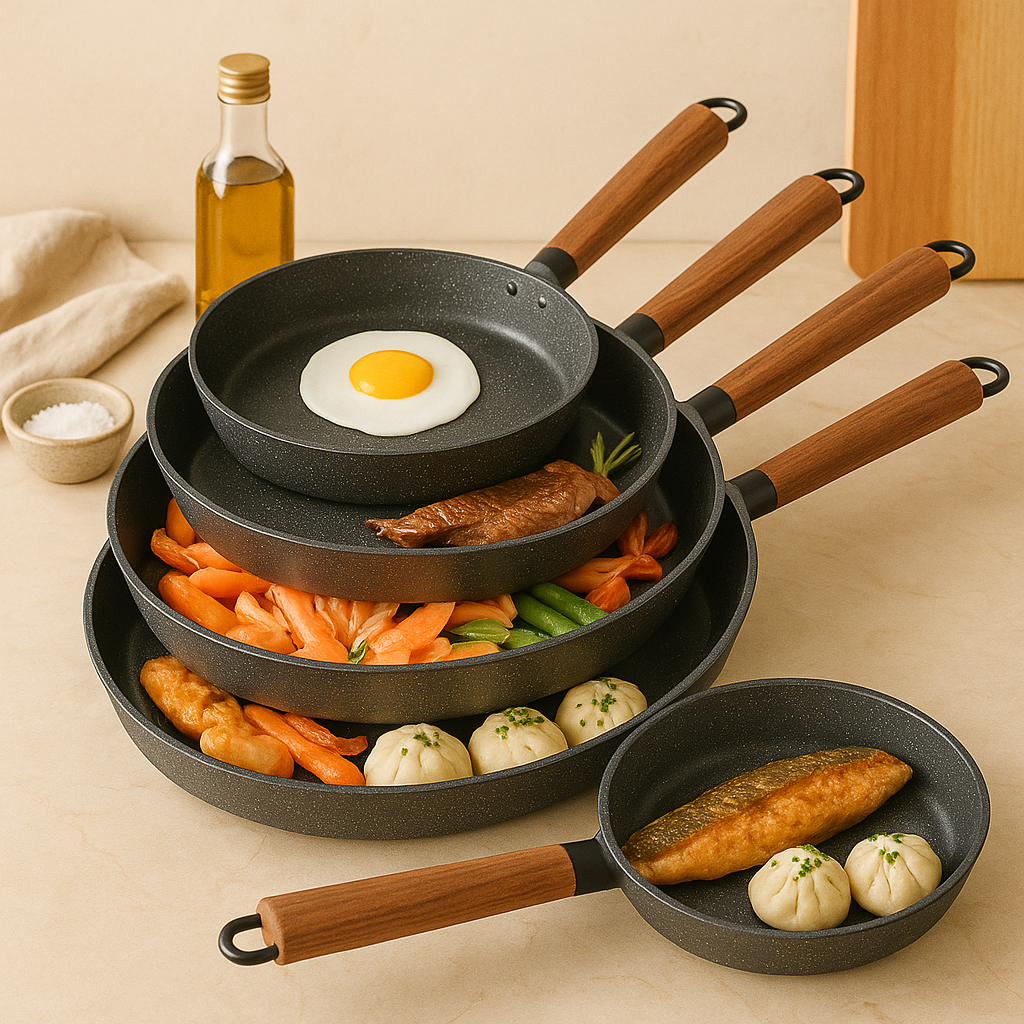 - Mehrere Größen: Enthält 24, 26, 28, 30 und 32 cm Pfannen für unterschiedliche Kochbedürfnisse.