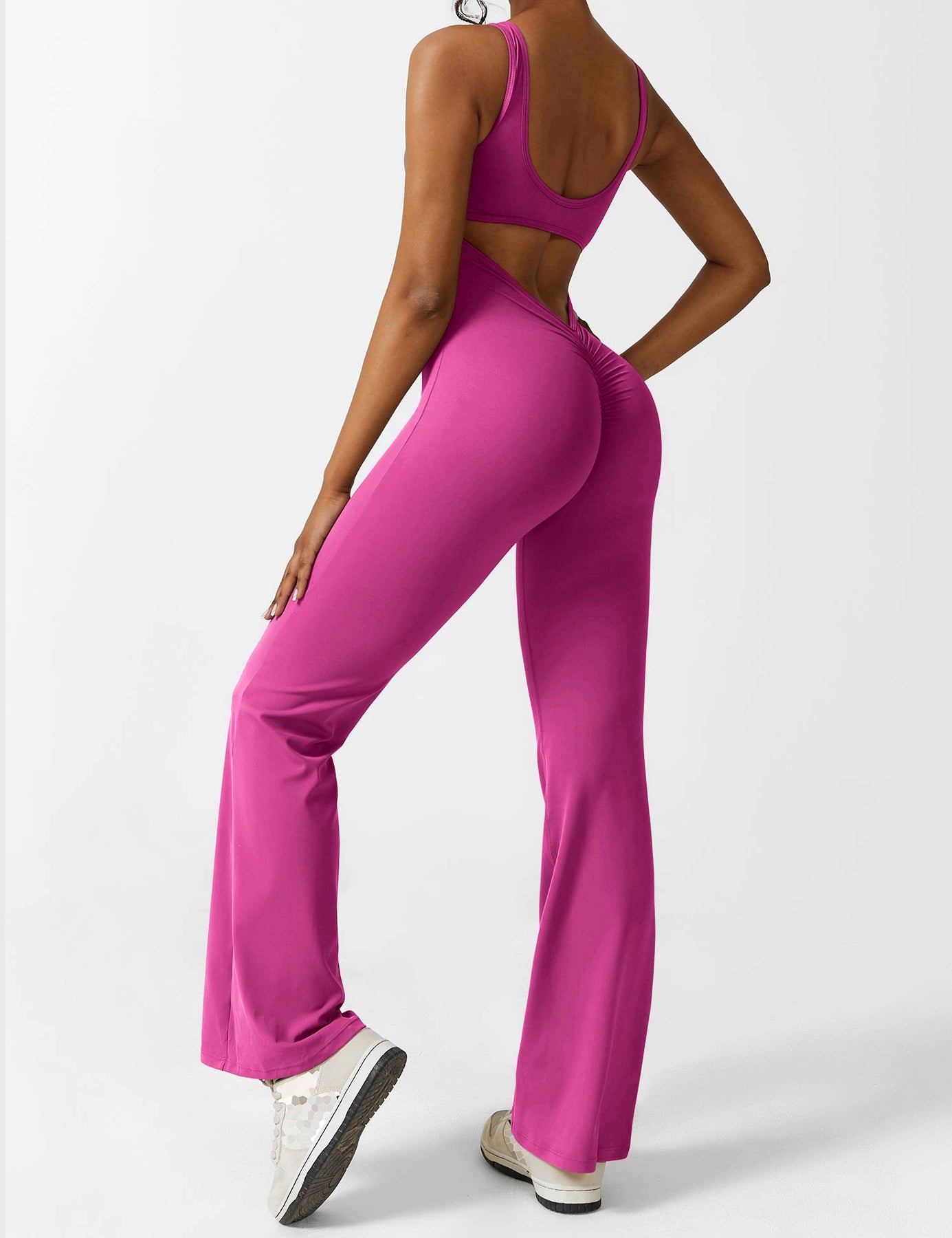 Der Sienna Rückenfreie Flare-Jumpsuit kombiniert Eleganz mit sportlicher Funktionalität. Der enganliegende, figurbetonte Schnitt schmeichelt der Silhouette, während das elastische Material höchsten Tragekomfort bietet. Das Highlight dieses Jumpsuits ist der stilvolle Rückenausschnitt mit gerüschtem Detail und das fließende Flare-Design an den Beinen – perfekt für Workouts, Tanz oder stylische Alltagslooks.