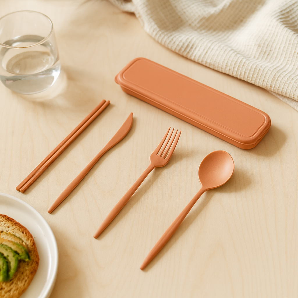 Mach jede Mahlzeit unterwegs schöner mit dem TerraGo | Reiseutensilien-Set. Dieses kompakte Besteckset bringt Komfort und Stil beim Campen, Picknick oder Reisen. Mit dem eleganten Aufbewahrungsetui hast du alles jederzeit griffbereit.