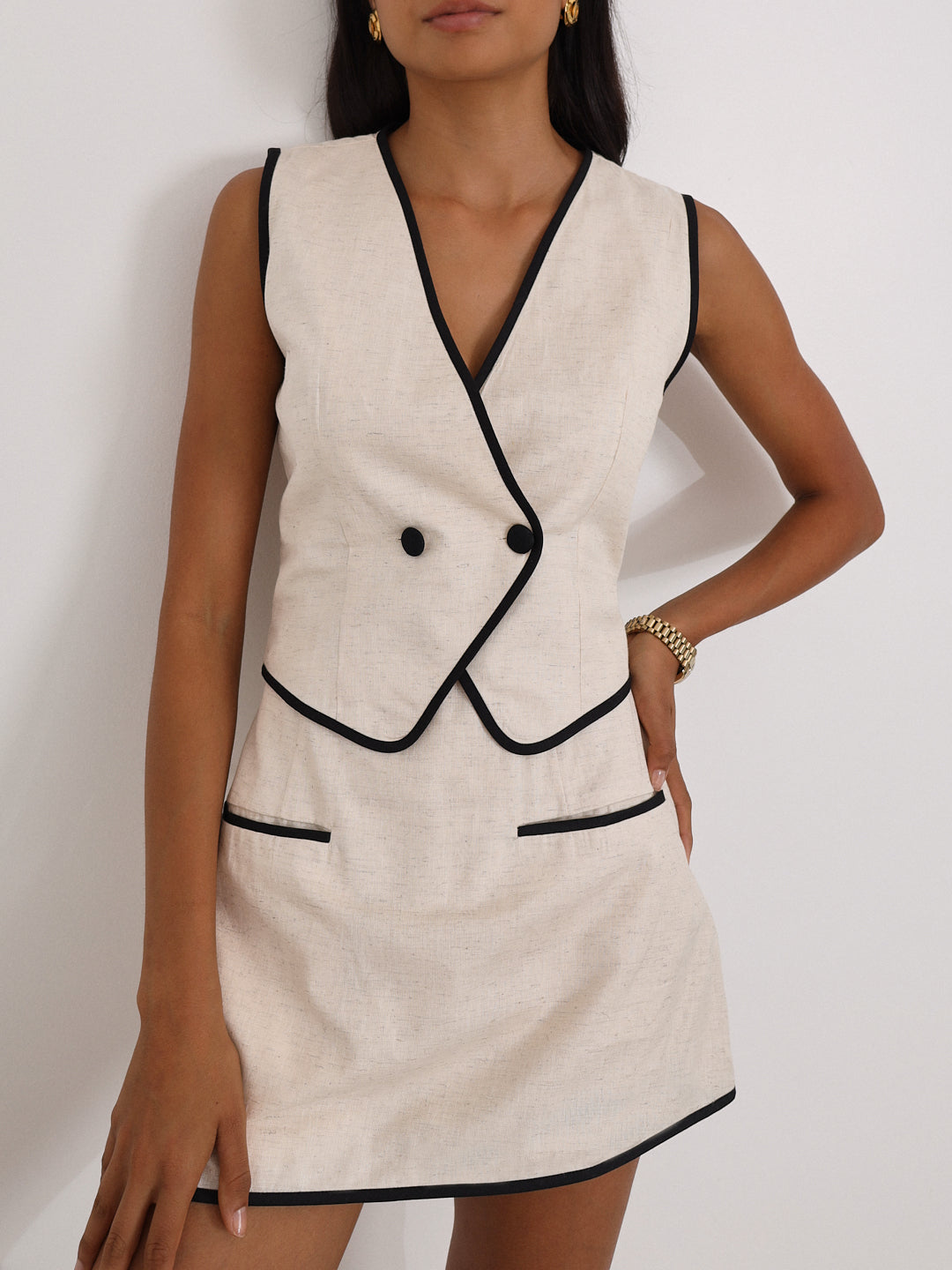 Tinas | Julii Leinen-Mix Kontrastkanten-Weste-Oberteil | Beige & Schwarz